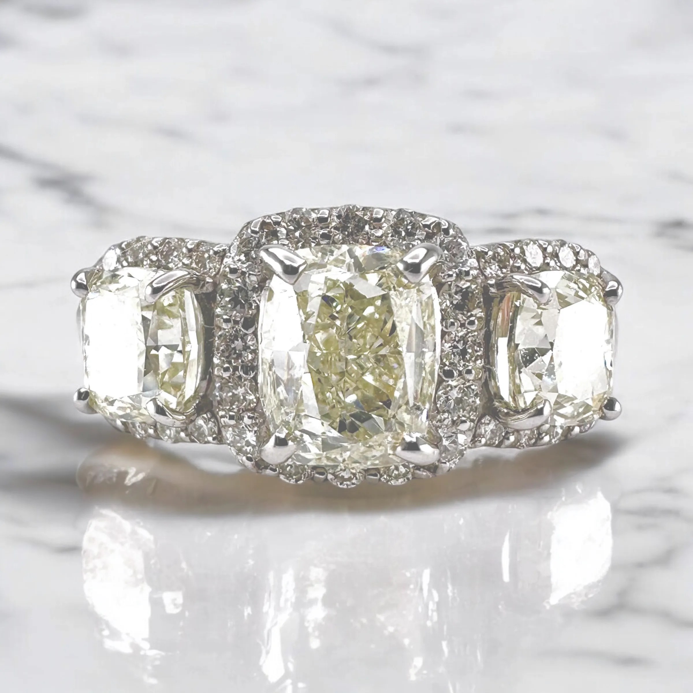両サイドのクッションダイヤモンドはVS1upクオリティの希少なセット。