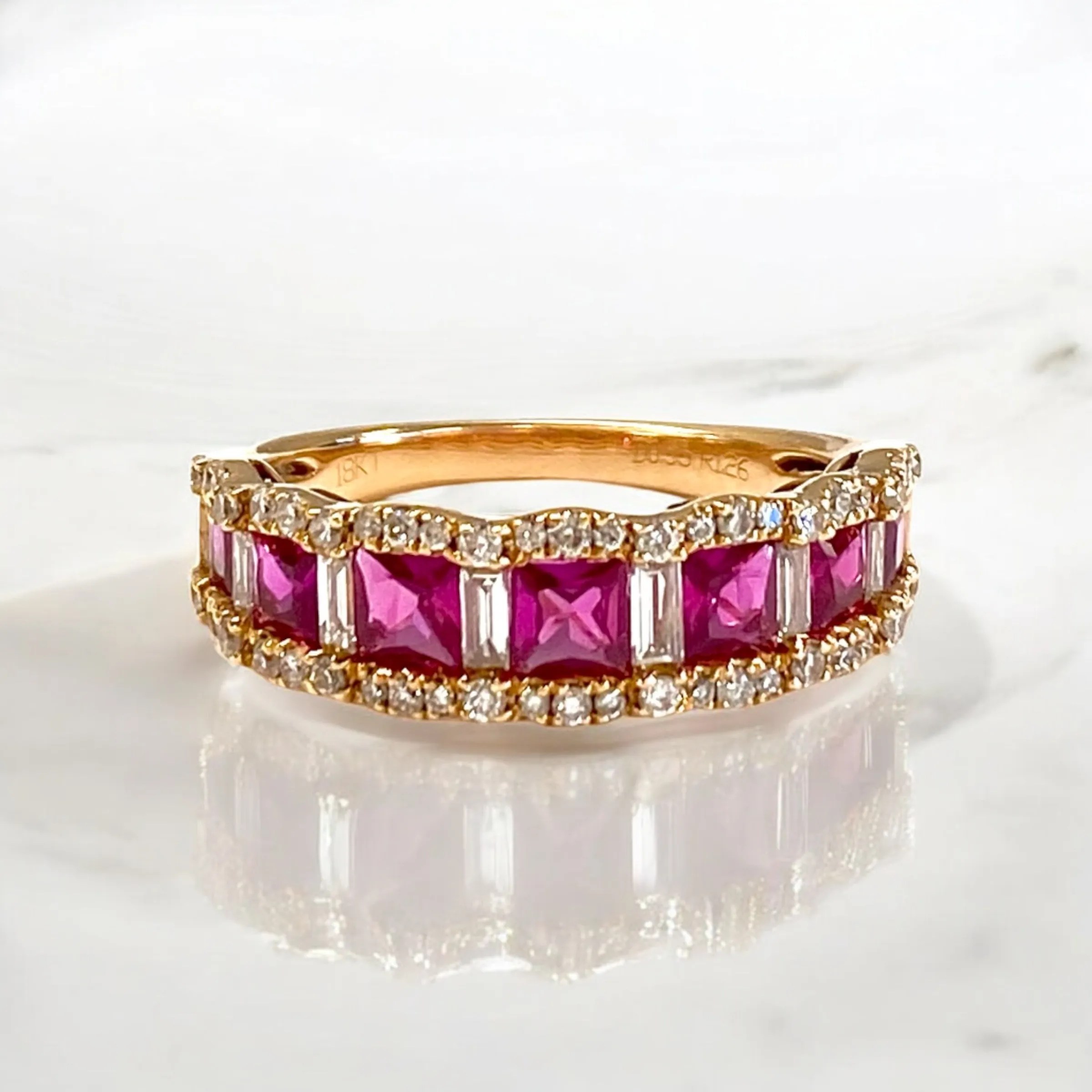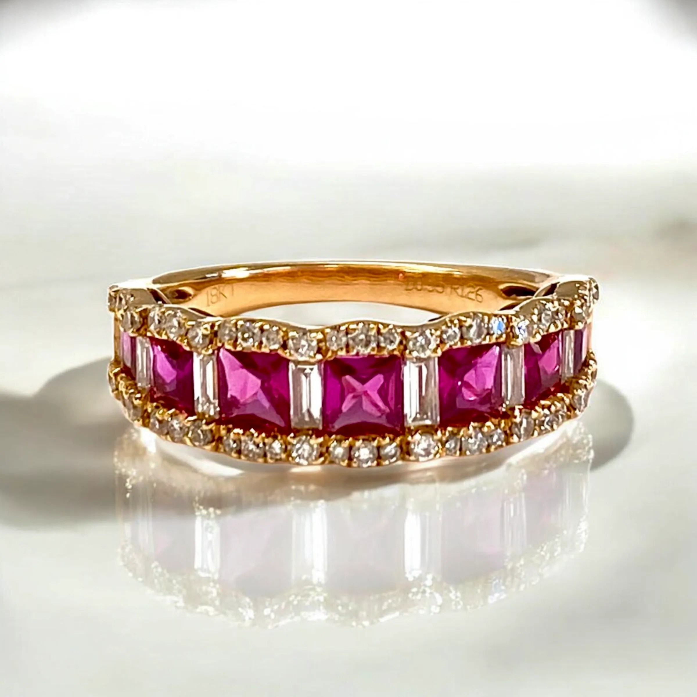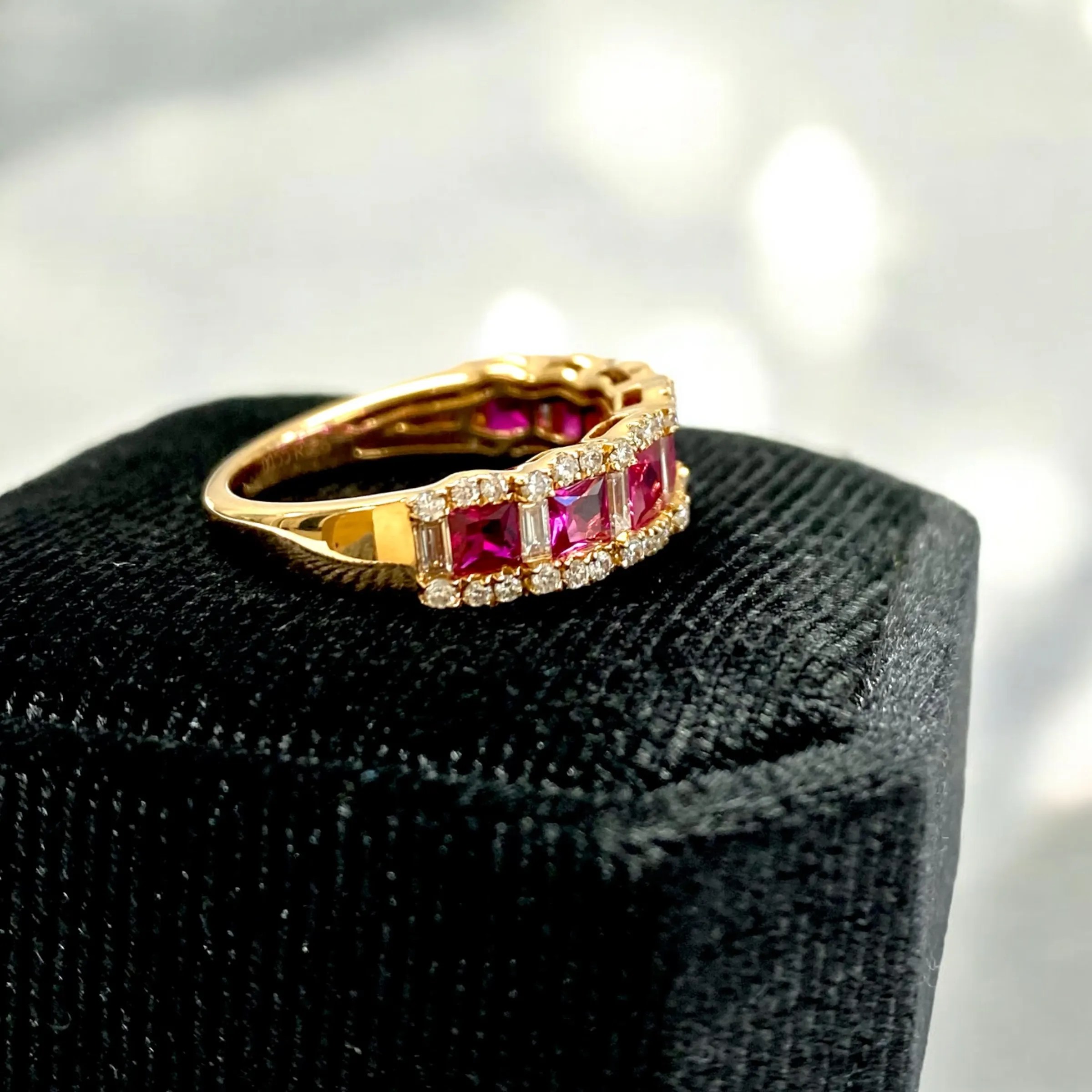 ルビーとルビーの間にバゲットカットを使っているのがポイントです。