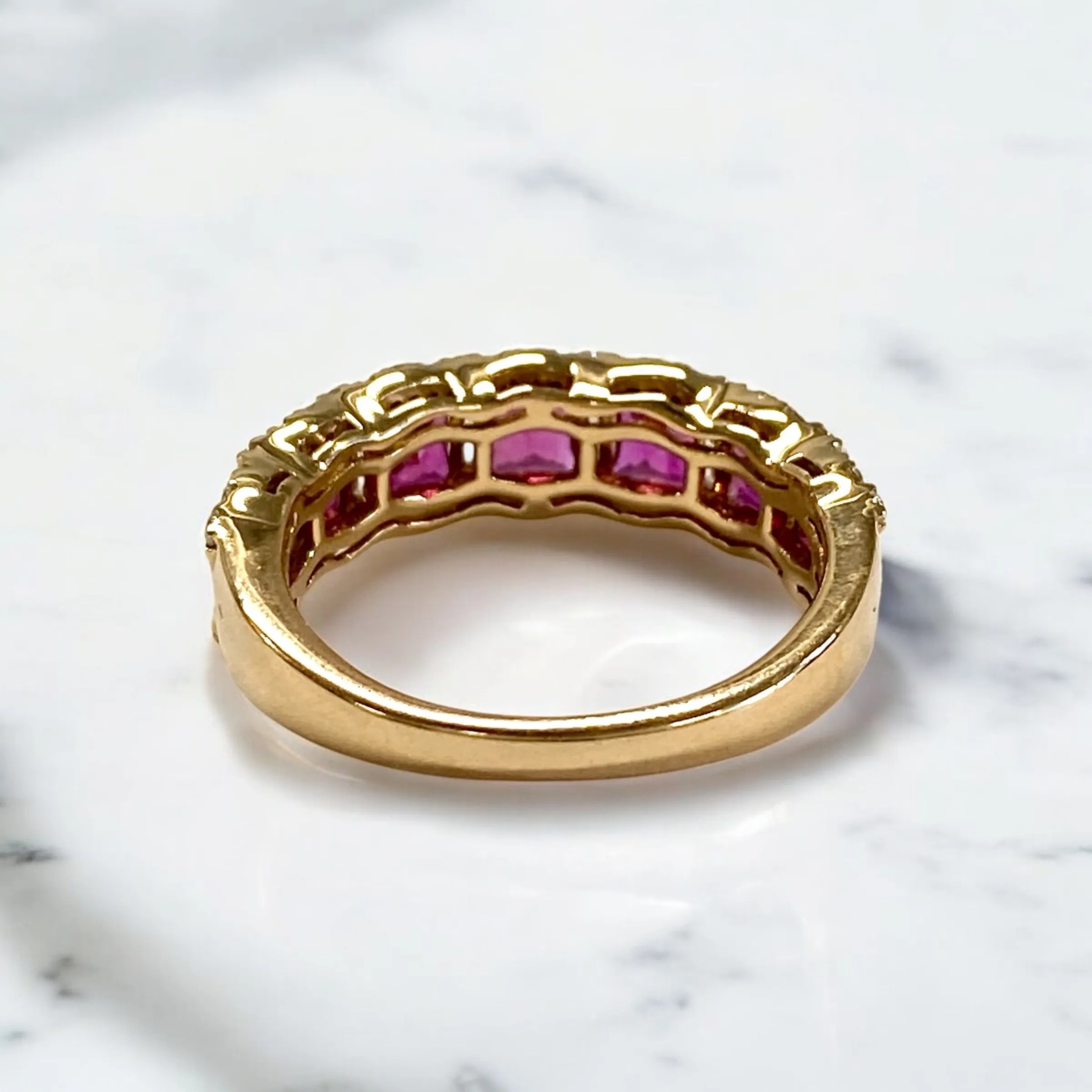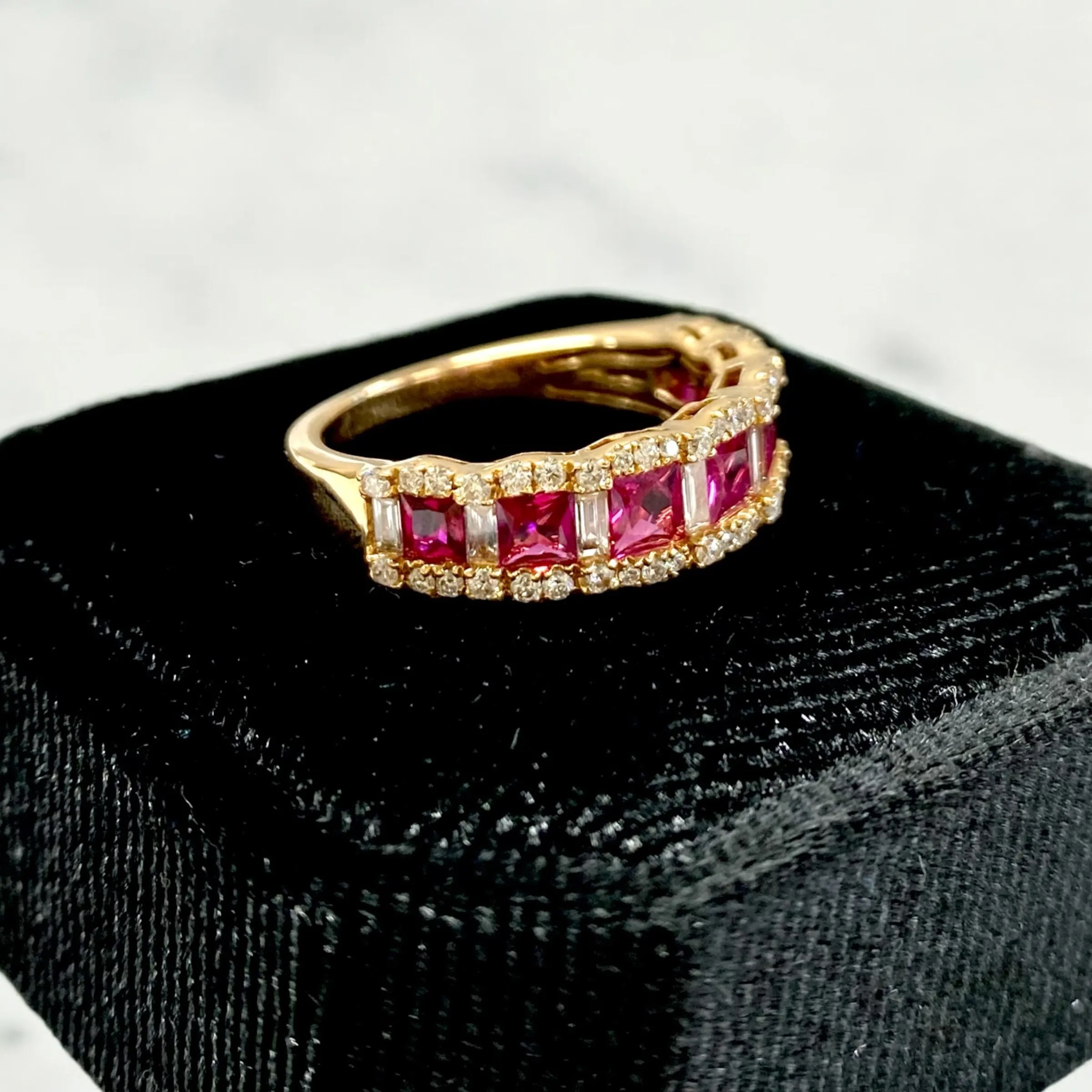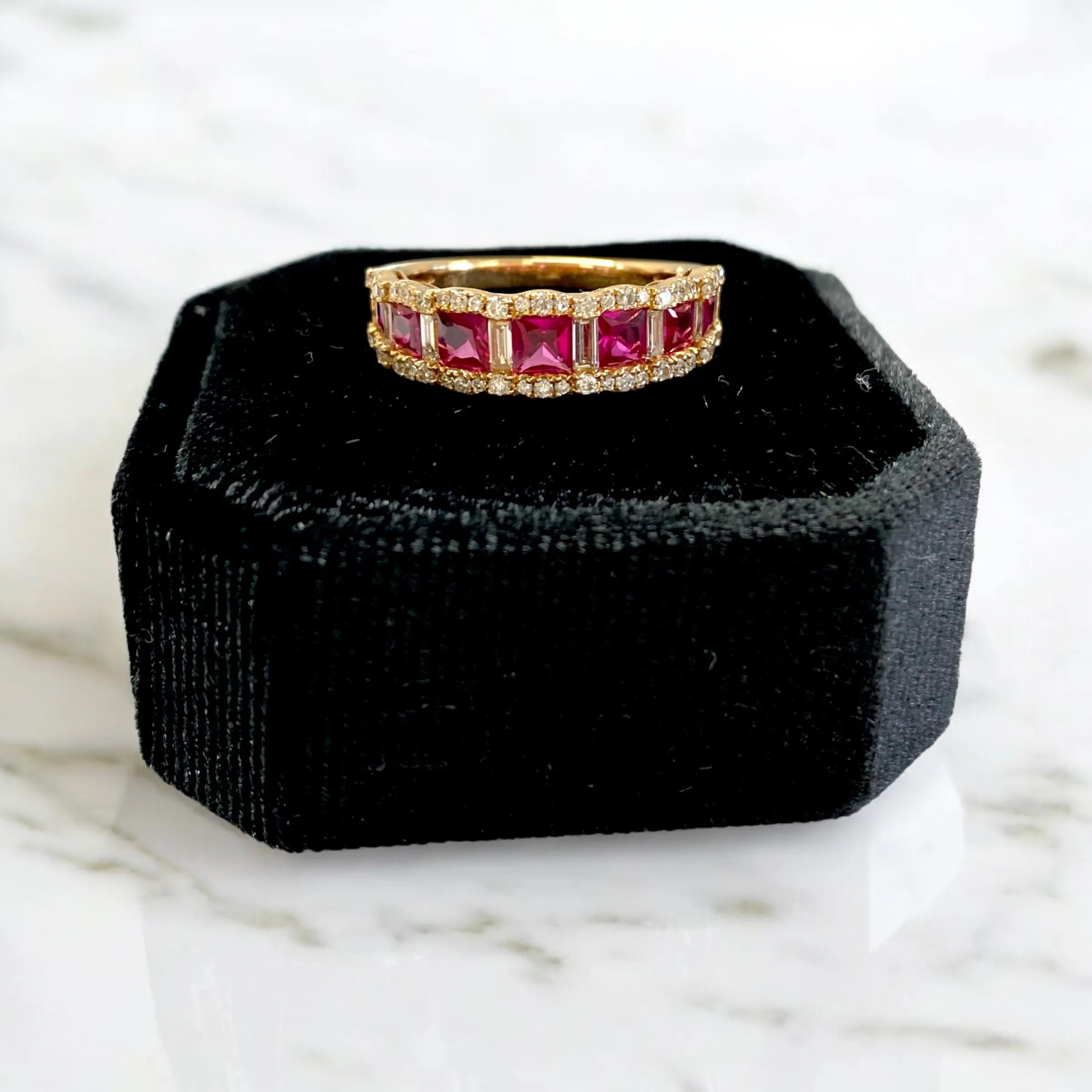 ルビーとルビーの間にバゲットカットを使っているのがポイントです。